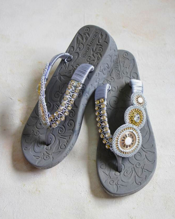 Ojotas nacionales intervenidas con apliques blancos y strass engarzado